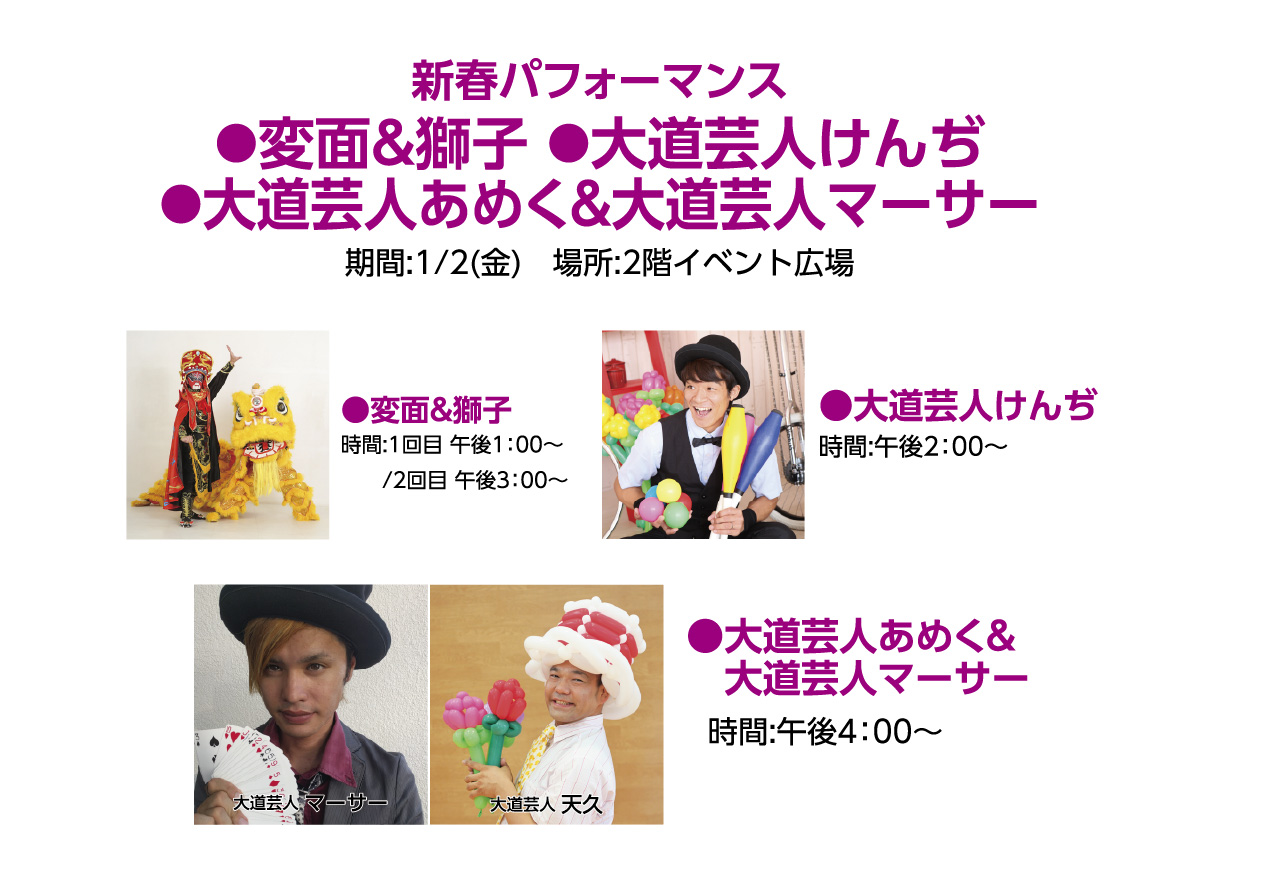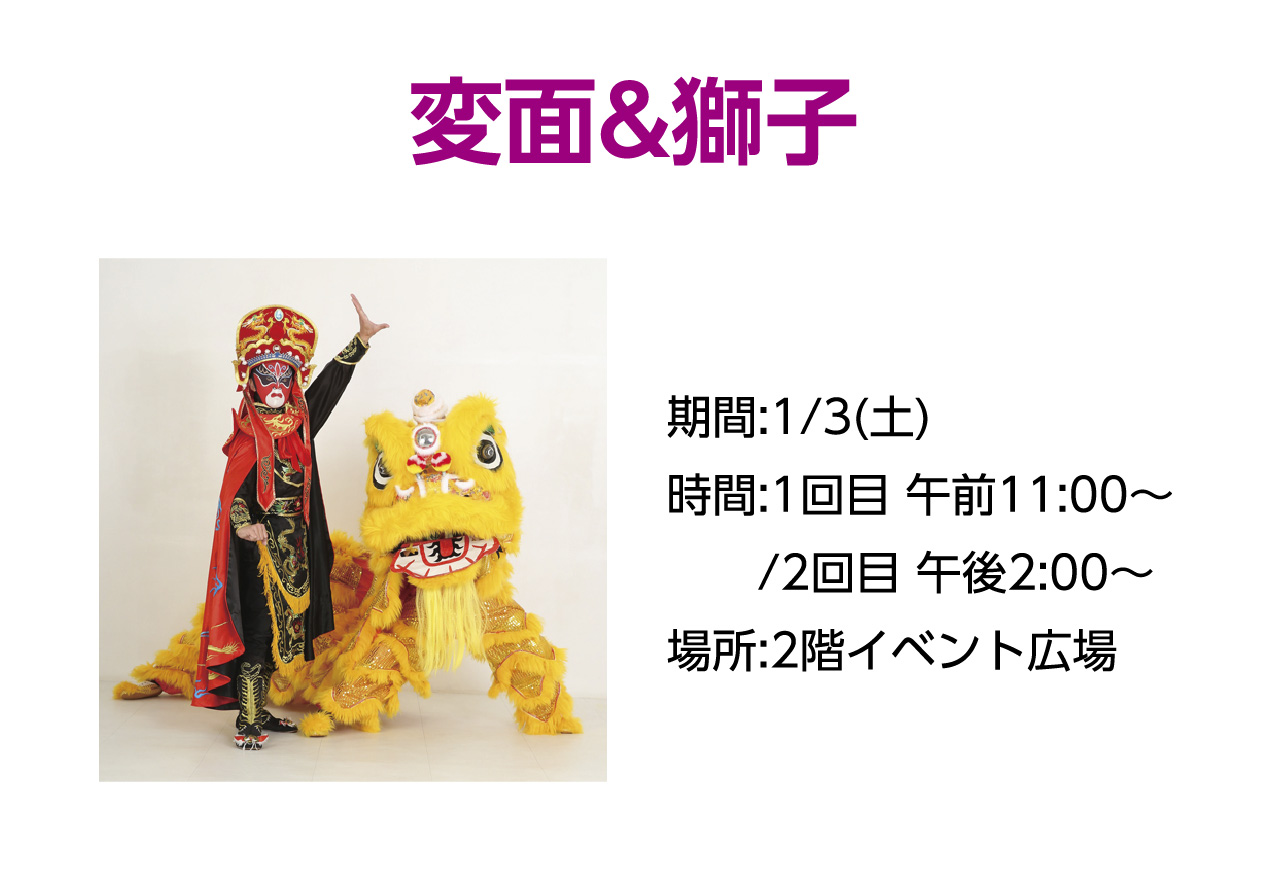 イベントの詳細新春パフォーマンス 変面&獅子 ・大道芸人けんぢ・大道芸人あめく&大道芸人マーサー【期間】