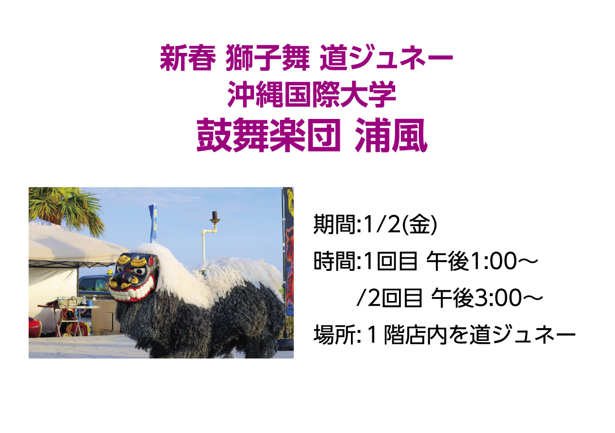 イベントの詳細新春 獅子舞 道ジュネー 沖縄国際大学 鼓舞楽団 浦風【期間】