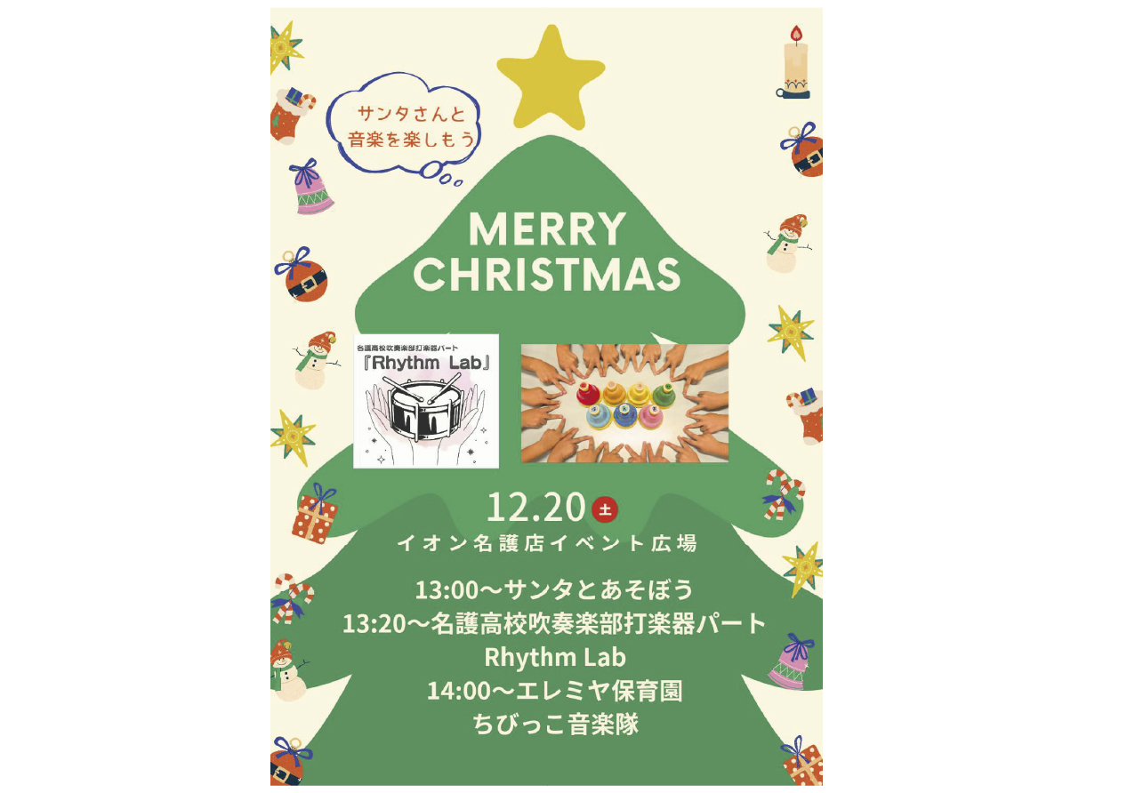- 13:00〜 サンタとあそぼう / 13:20〜 名護高校吹奏楽部打楽器パート Rhythm Lab / 14:00〜 エレミヤ保育園 ちびっこ音楽隊
