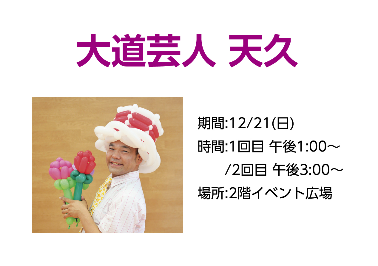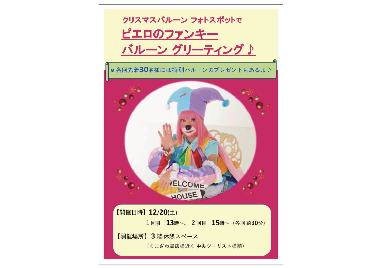 イベントの詳細クリスマスバルーン フォトスポットで ピエロのファンキー バルーングリーティング♪【期間】