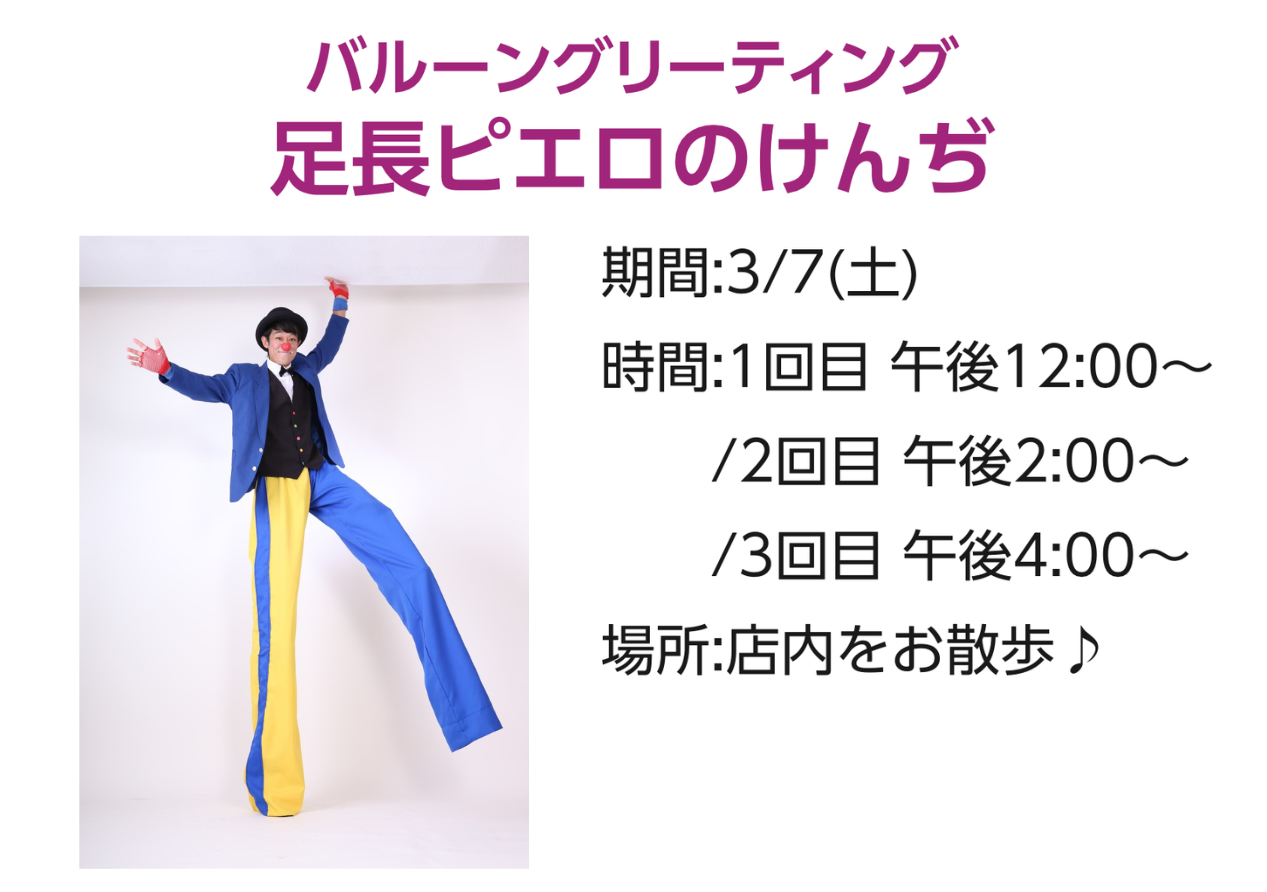 イベントの詳細バルーングリーティング 足長ピエロのけんぢ【期間】
