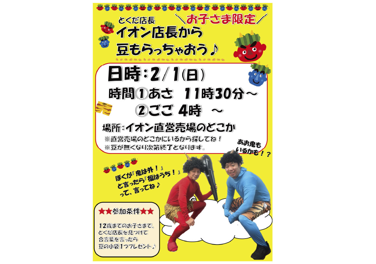 イベントの詳細お子さま限定 イオン店長から 豆もらっちゃおう♪【期間】