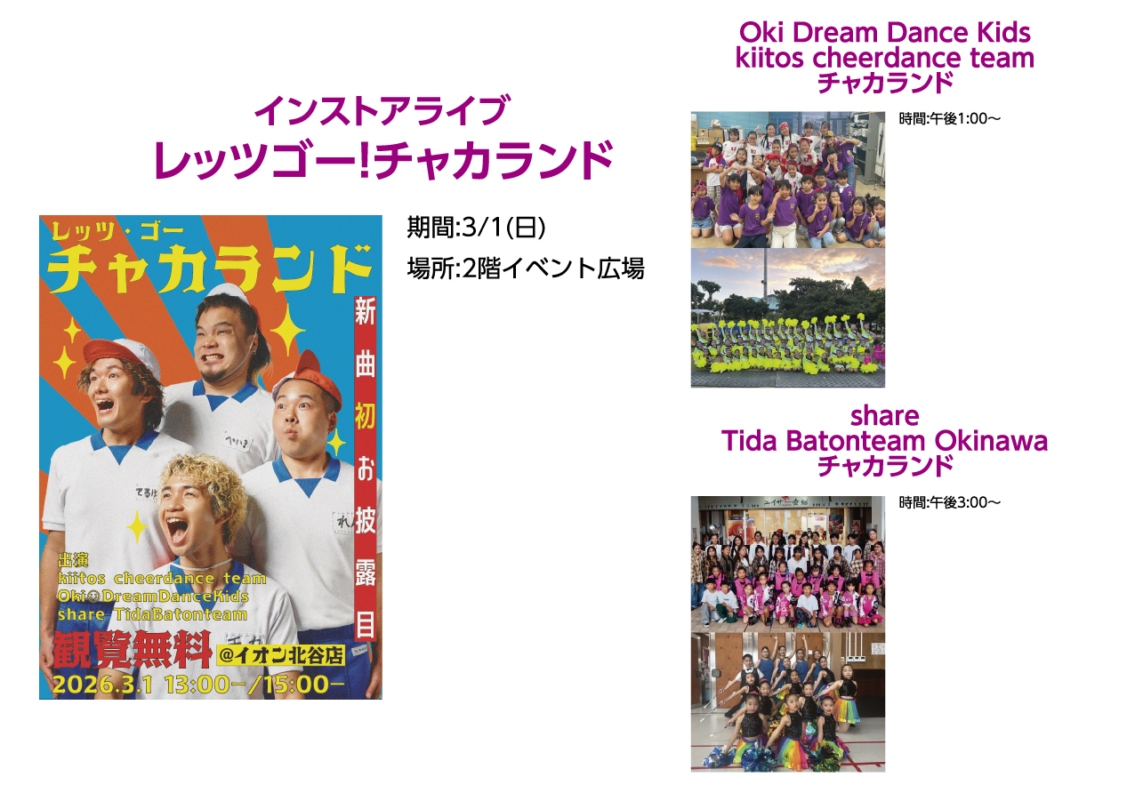 イベントの詳細インストアライブ レッツゴー!チャカランド(Oki Dream Dance Kids kiitos cheerdance team チャカランド / share Tida Batonteam Okinawa チャカランド)【期間】