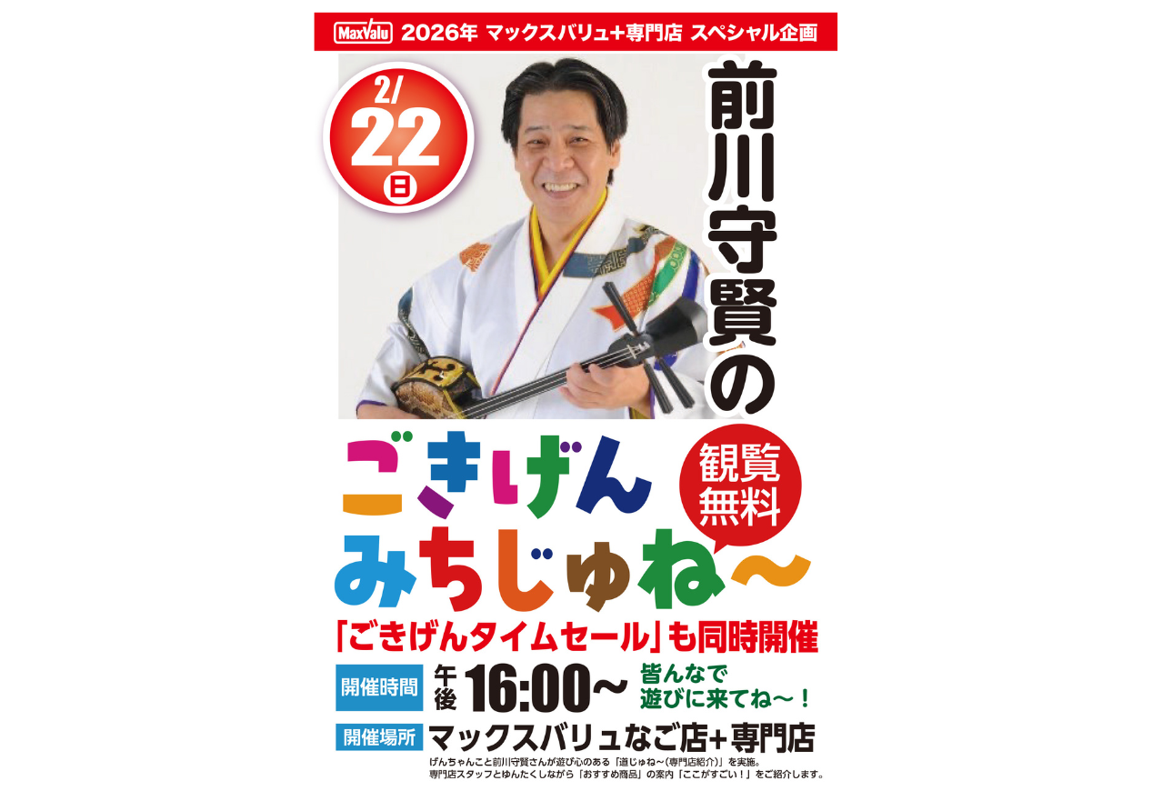 イベントの詳細前川 守賢のごきげんみちじゅね〜 「ごきげんタイムセール」も同時開催@マックスバリュなご店【期間】