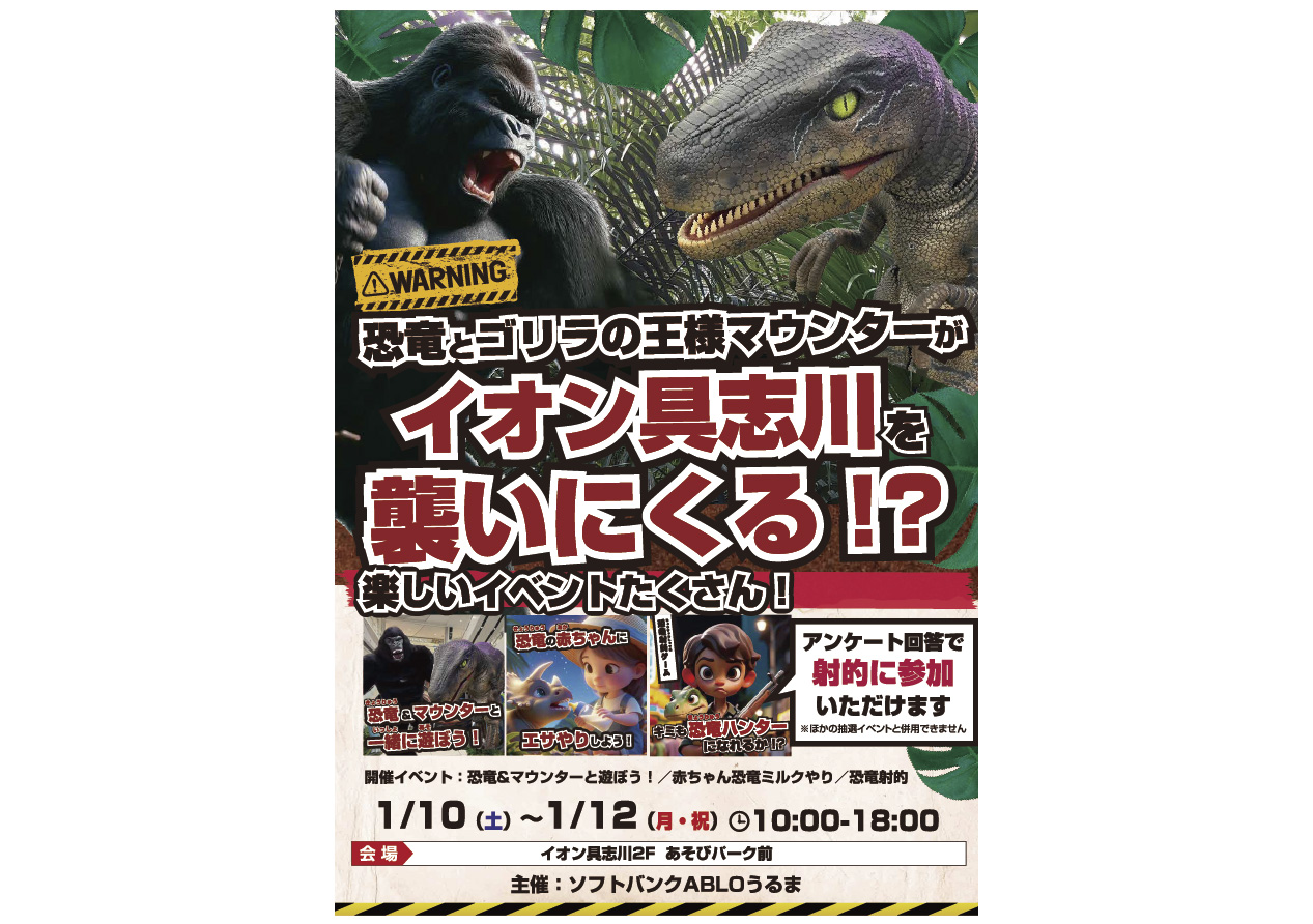 イベントの詳細恐竜とゴリラの王様マウンターがイオン具志川を襲いにくる!?【期間】