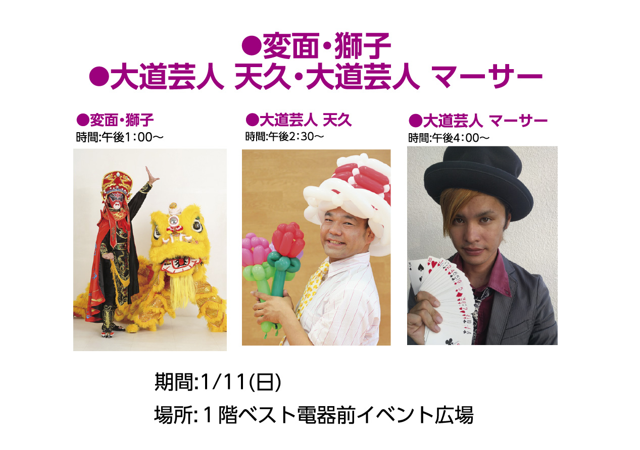 イベントの詳細⚫︎変面・獅子 ⚫︎大道芸人 天久・大道芸人 マーサー【期間】