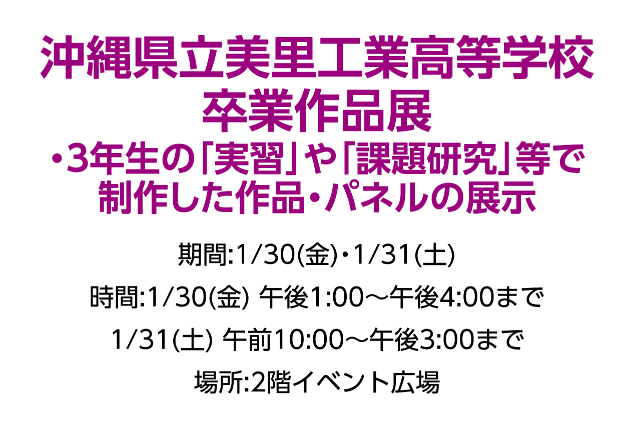 イベントの詳細沖縄県立美里工業高等学校 卒業作品展 ・3年生の「実習」や「課題研究」等で制作した作品・パネルの展示【期間】