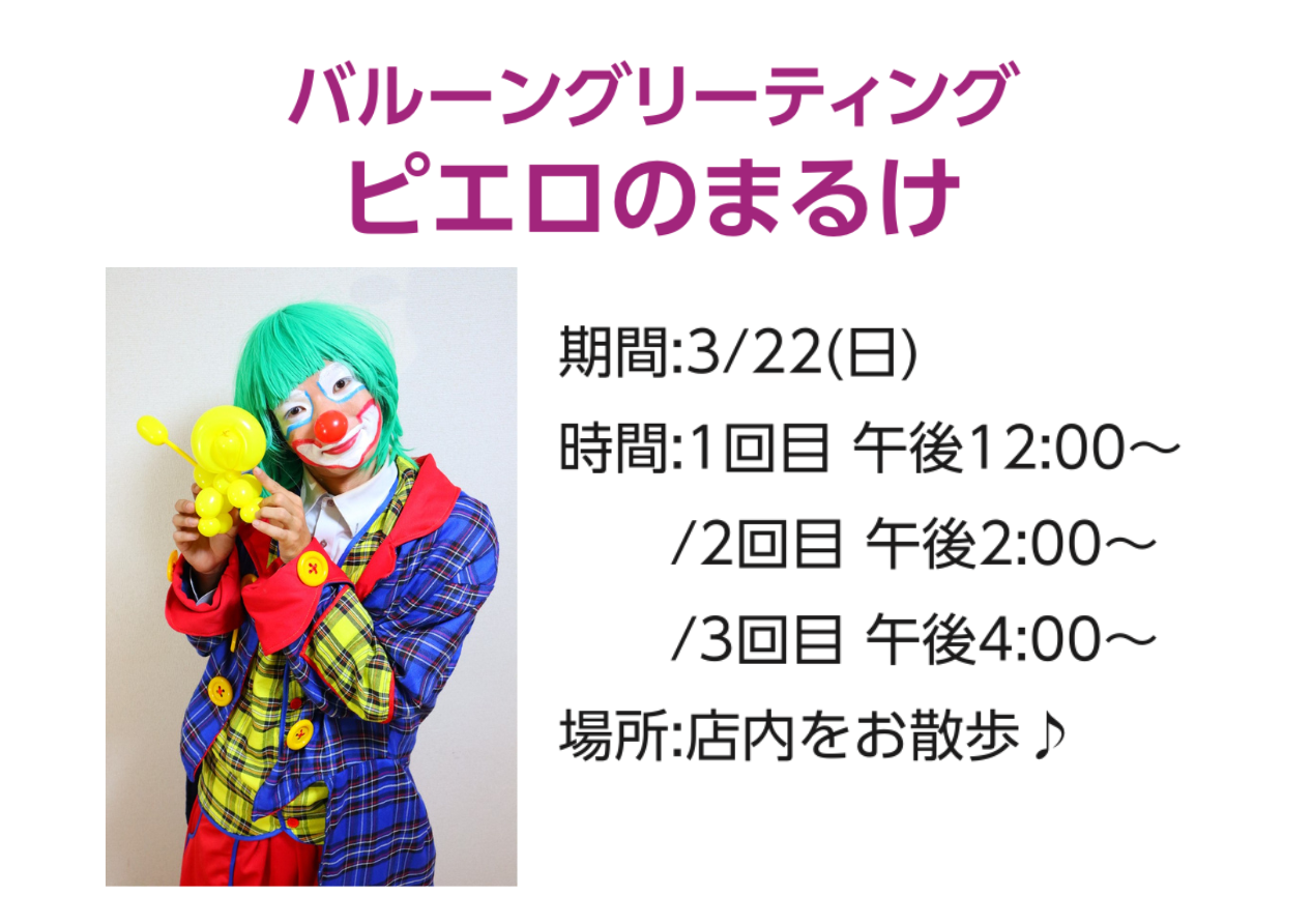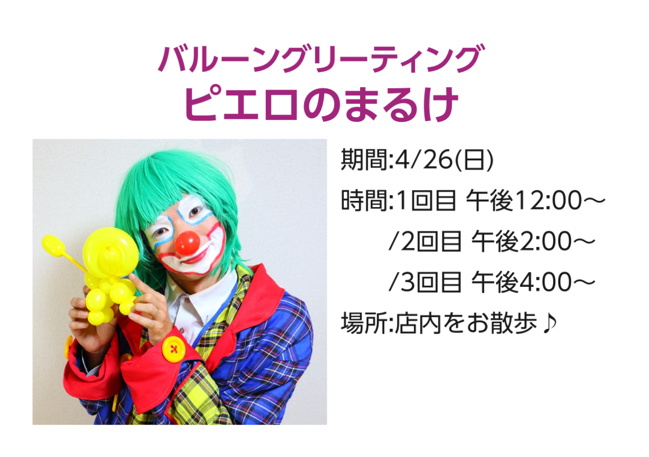 イベントの詳細バルーングリーティング ピエロのまるけ【期間】