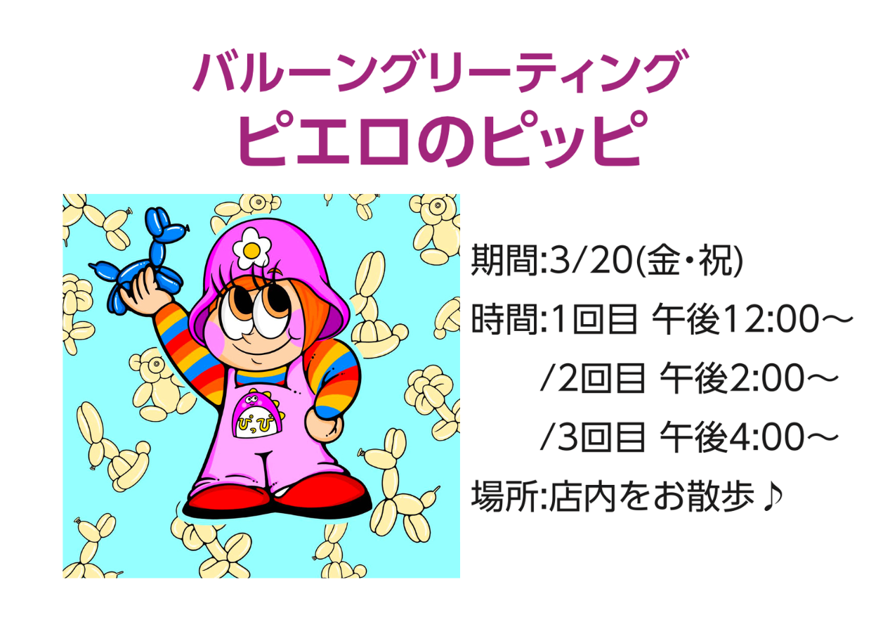 イベントの詳細バルーングリーティング ピエロのピッピ【期間】
