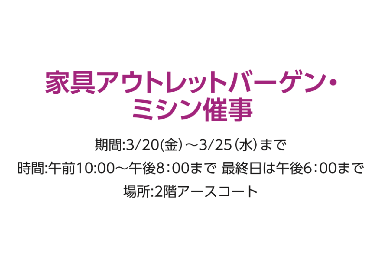 イベントの詳細家具アウトレットバーゲン・ミシン催事【期間】