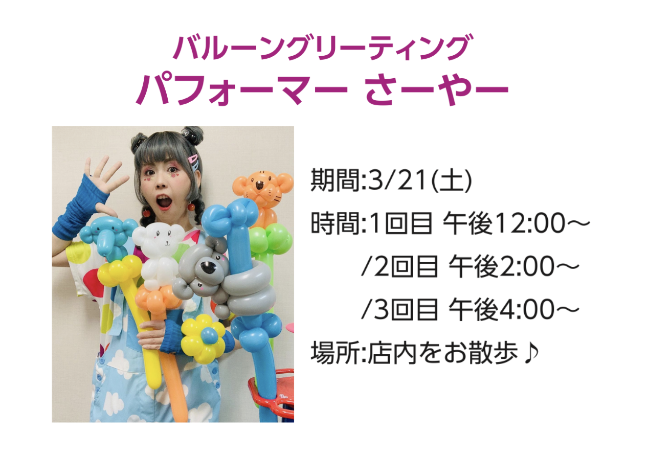 イベントの詳細バルーングリーティング パフォーマー さーやー【期間】