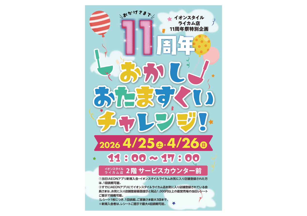 ①当日iAEONアプリ新規入会・イオンスタイルライカムお気に入り店舗登録された方は、1回挑戦可能。