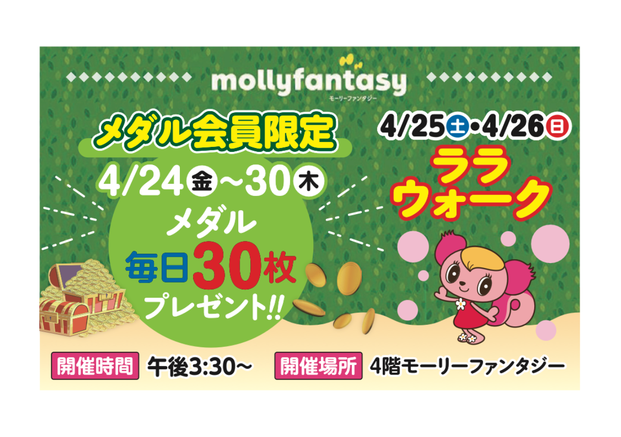 メダル会員限定 メダル毎日30枚プレゼント:4月24日(金)〜 4月30日(木) / ララウォーク:4月25日(土)・4月26日(日)