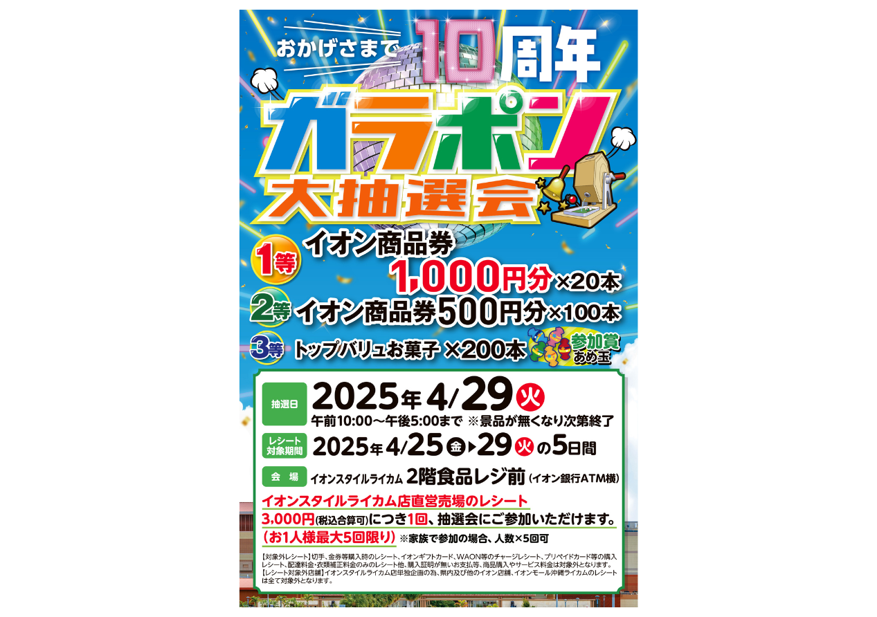 イオンスタイルライカム直営店のレシート3,000円(税込合算可)につき1回、抽選会にご参加いただけます。(お1人様最大5回限り)