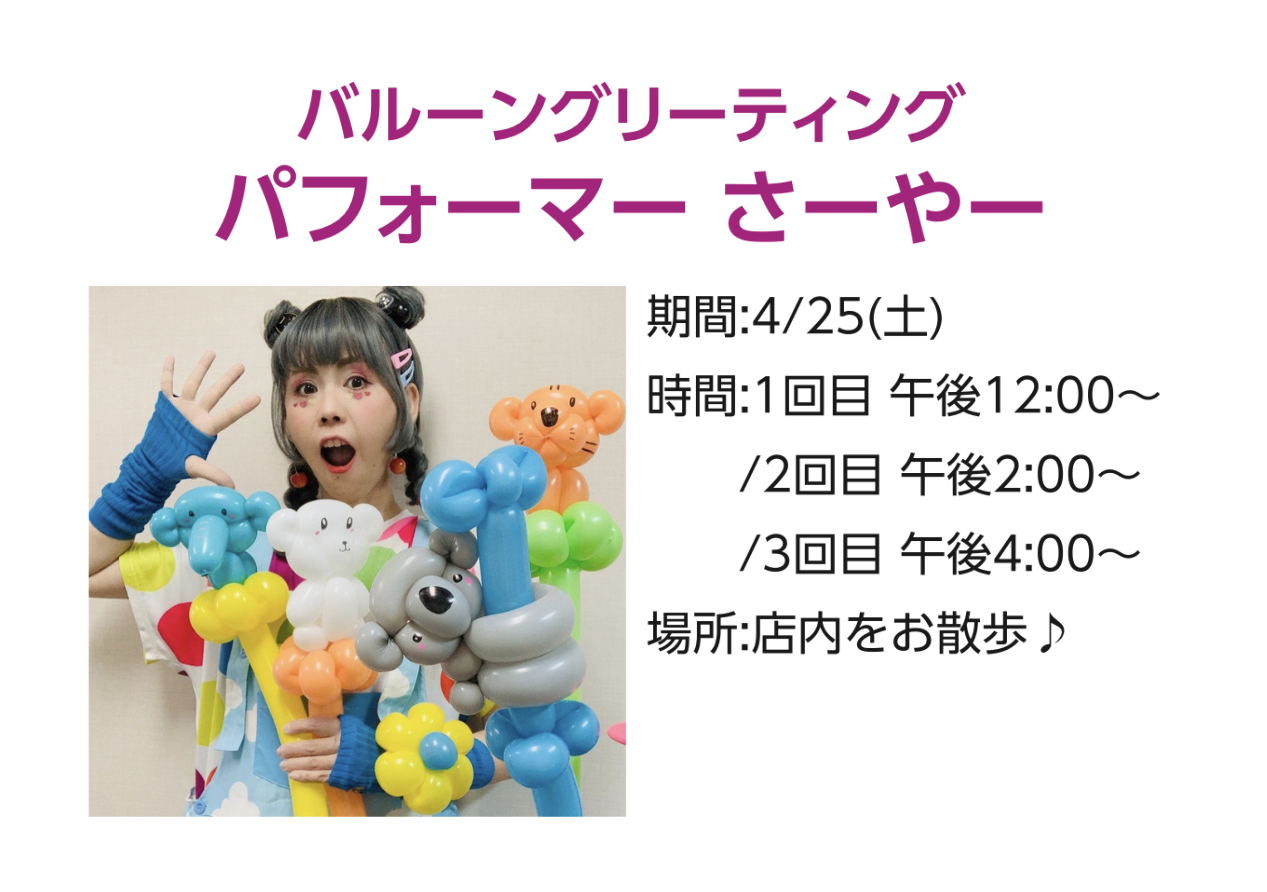 イベントの詳細バルーングリーティング パフォーマーさーや一【期間】