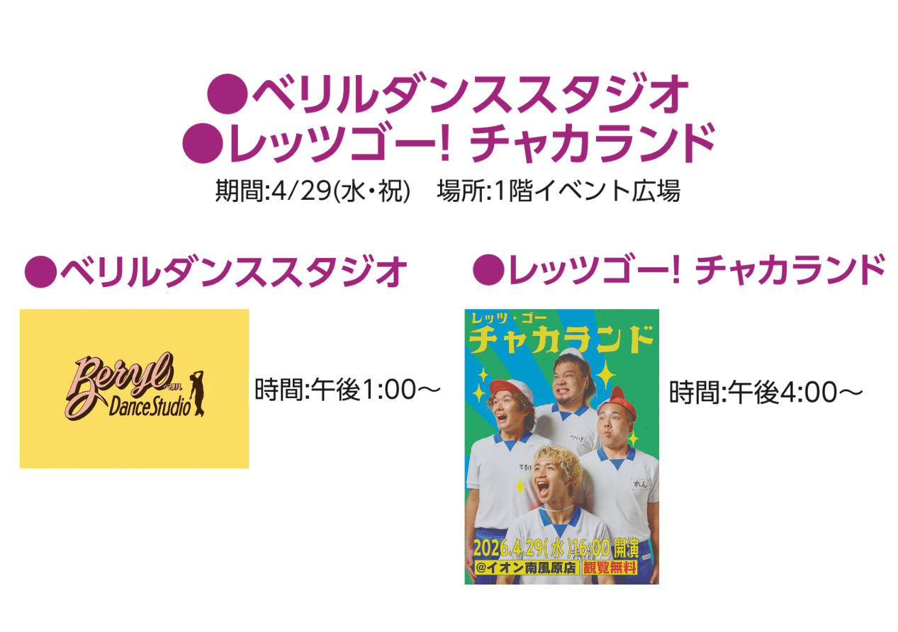 - ベリル ダンススタジオ:13:00~ / レッツゴー!チャカランド:16:00~