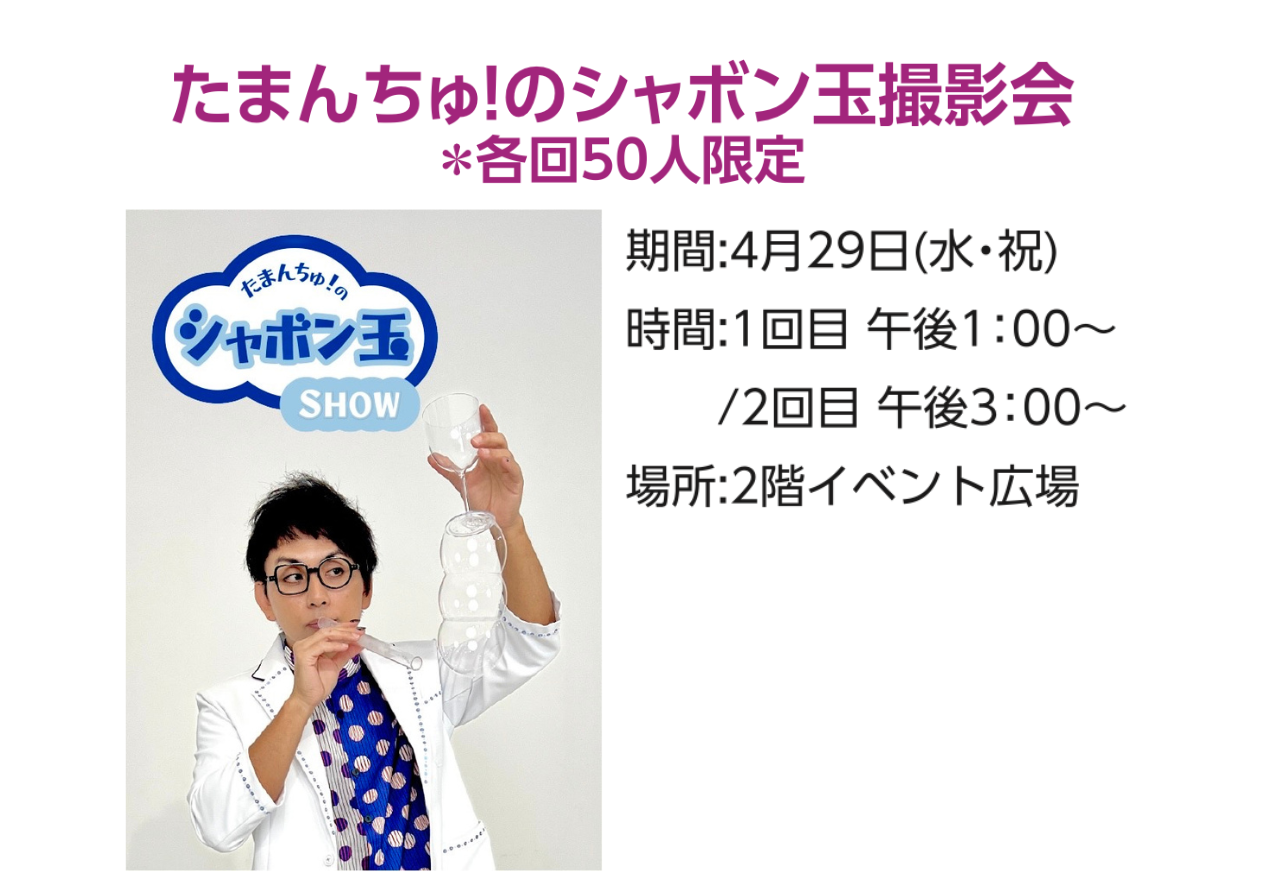 イベントの詳細たまんちゅ!のシャボン玉撮影会*各回50人限定【期間】