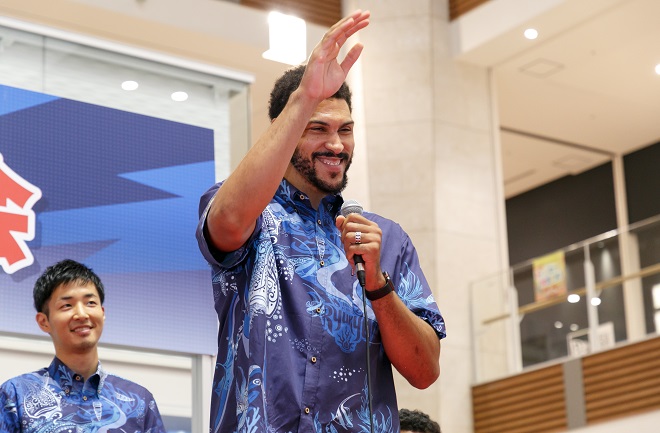続いて挨拶をしたのがキャプテンの岸本隆一選手。「昨シーズンは悔しい結果に終わりましたが、あれから練習を重ね関西アーリーカップも優勝することができました。今シーズンもブースター、そしイオン琉球様をはじめとするパートナー様のお力を借りて沖縄を盛り上げていたいと思います」と語ってくれました。