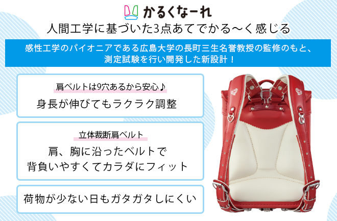 また、マチを11cmから12cmにアップすることで、さらに容量UP! そして三点の背あて「かるくなーれ」を取り入れることで背負いやすく、疲れにくい仕様に。背中への負荷を分散させ、重さを軽減する効果も。