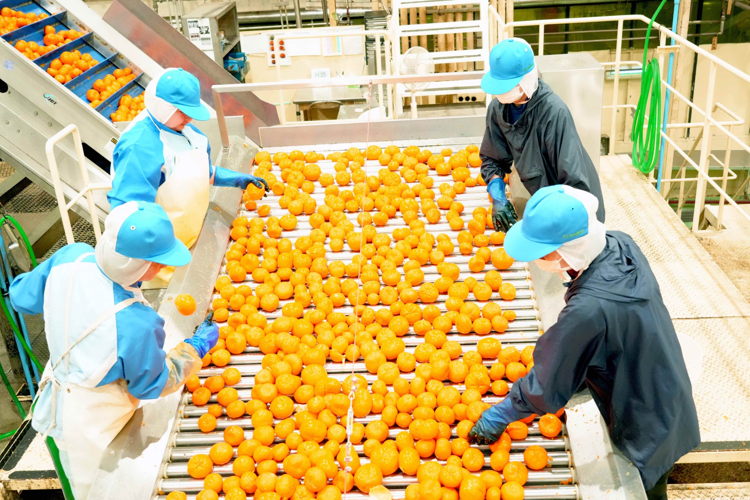 ポンジュースの製造が始まったのは1952年。みかんなどのかんきつ原料を搾汁し、ストレート果汁や濃縮果汁を製造しています。工場には大きな設備が並び、それぞれの工程のポイントでスタッフによるチェックを受けながら、みかん類がコンベアーを流れていく様子が見られました。