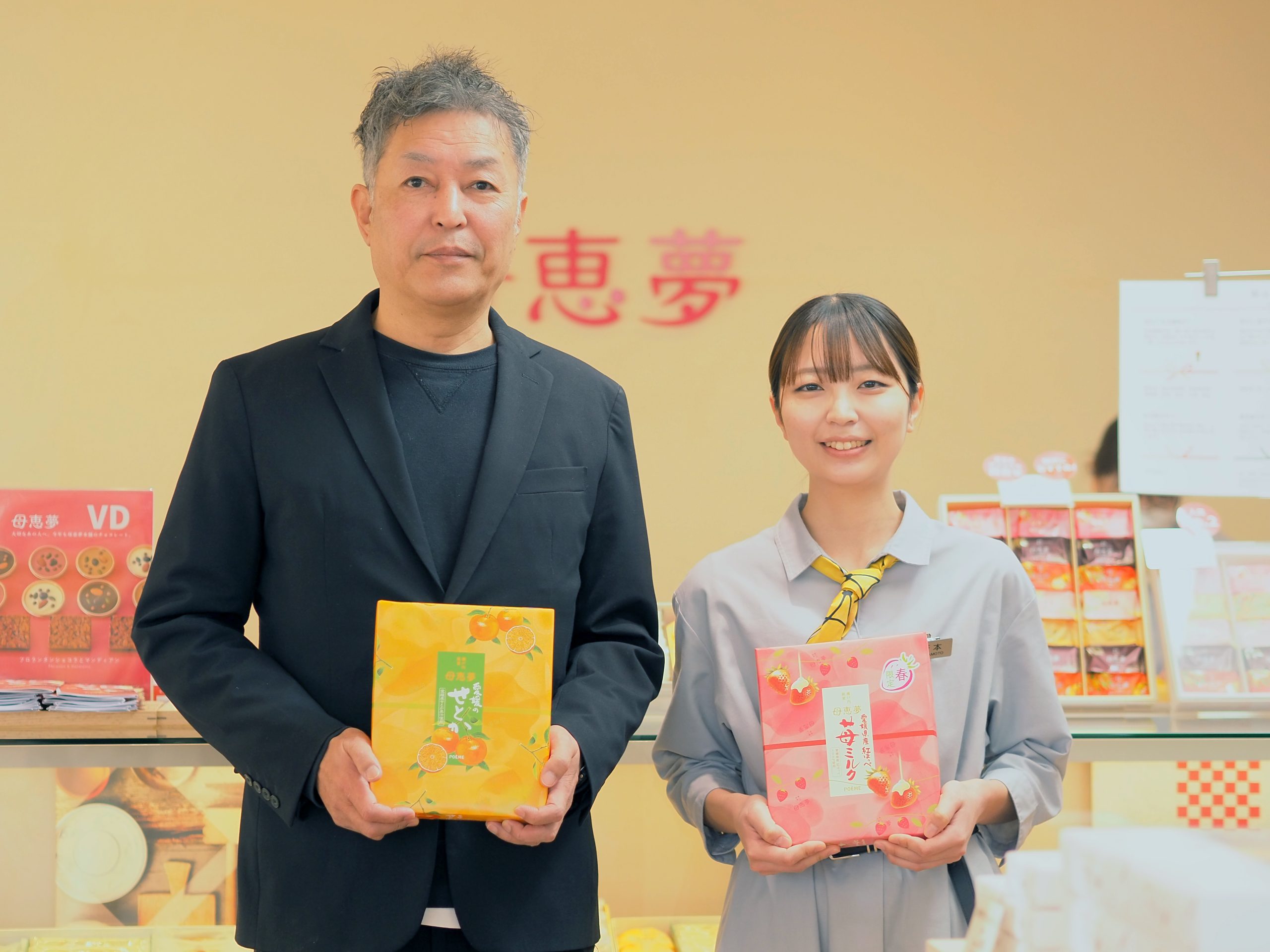 「代表商品の『母恵夢』は、バターを使った口溶けのいい生地で卵の黄身を贅沢に使ったあんを包んでいます。少し小さめサイズの『ベビー母恵夢』が人気で、愛媛産のかんきつ「せとか」や、苺の「紅ほっぺ」などを使った種類があります」。