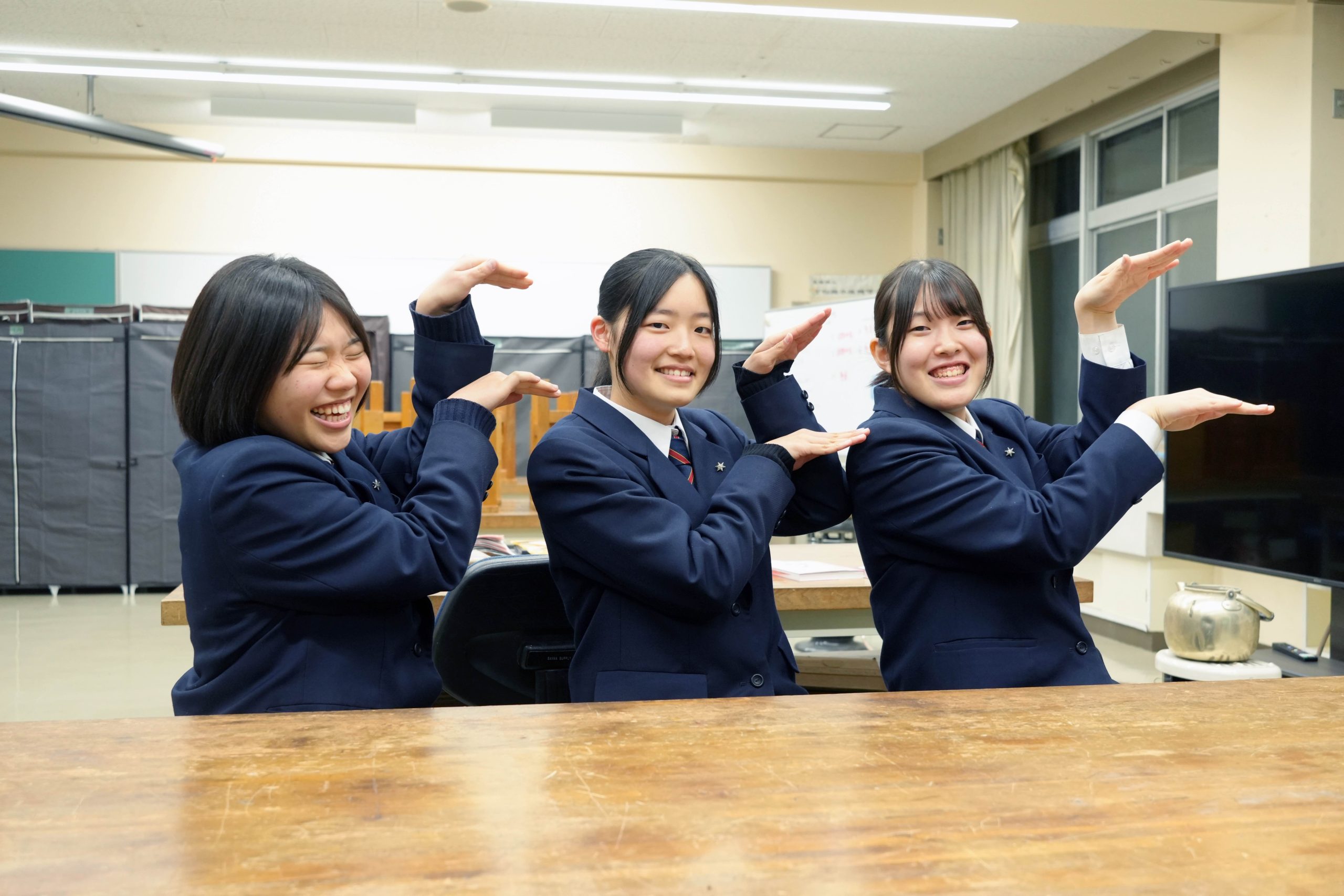 フィッシュガールの「F」を手文字で作ってくれたのは、宇和島水産高校2年生の池田さん、末波さん、木村さんの3人。女子高生らしいかわいい彼女たちが、自分のからだよりも大きなマグロを豪快にさばく「フィッシュガール」だとは、ショーを見るまでは信じられないかもしれません。