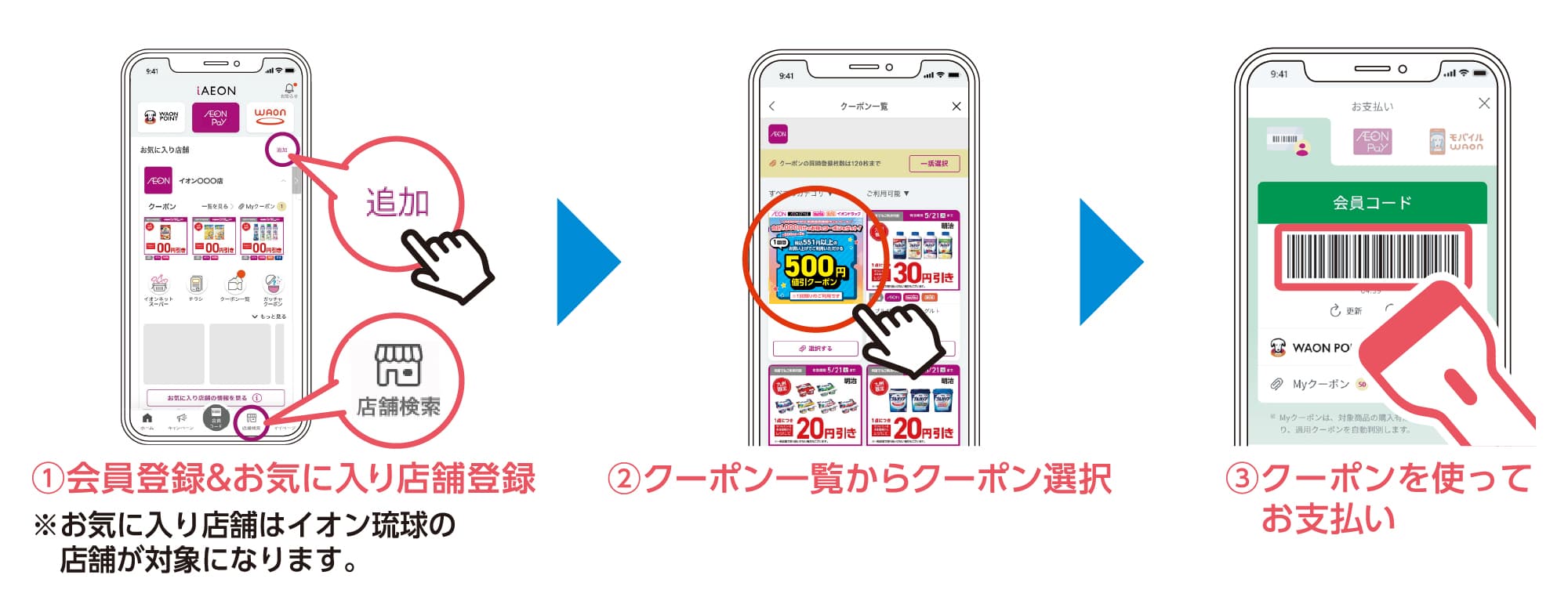 キャンペーン期間中、iAEONアプリをダウンロード後会員登録し、イオン琉球の店舗をお気に入り登録したお客さまに、もれなくイオン琉球で使えるお得なクーポンをプレゼントします。
